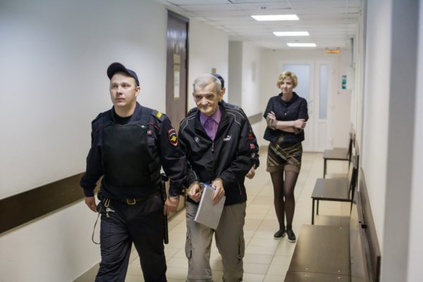 Юрий Дмитриев в суде. На заднем плане, за конвоем — дочь Дмитриева Катя. У нее есть несколько секунд, чтобы сказать: «Папа!» Фото: Игорь Подгорный