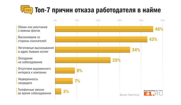 Ранее Зарплата.ру составила ТОП самых популярных причин провала на собеседовании. Выяснилось, что наиболее частой причиной для отказа в найме является обман или умолчание о важных фактах – 46% работодателей хотя бы один раз поступали таким образом. Ещё 43% – из-за высокомерия со стороны соискателей.