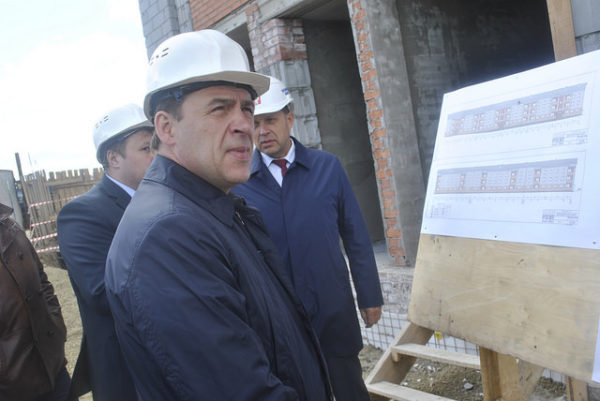 “Пятилетка развития” должна значительно улучшить жизнь в малых городах и поселках Свердловской области, где руководитель региона – гость не редкий. Е. В. Куйвашев инспектирует строительство многоквартирного дома для жителей аварийного жилья в поселке Вьюжный Волчанского городского округа. Фото: Александр Ярошук, «Вечерний Карпинск».