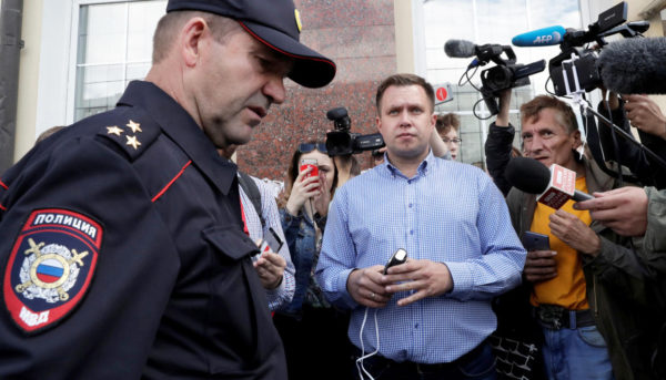 Координатор московского штаба Алексея Навального Николай Ляскин и сотрудник московской полиции у здания штаба на Садовнической набережной, 6 июля 2017 года. Фото: Татьяна Макеева / Reuters / Scanpix / LETA