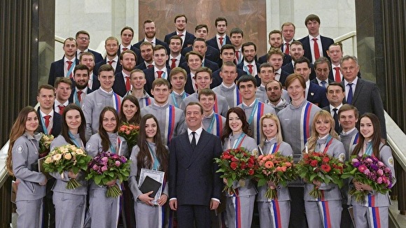 Премьер-министр РФ Дмитрий Медведев и 46 олимпийцев, награжденные автомобилями. Фото: Premier.gov.ru/Global Look Press