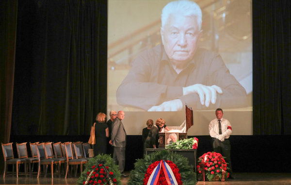Гроб с телом писателя установлен на сцене, вокруг возложены алые розы, стоят венки....