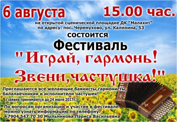Фестиваль «Играй, гармонь! Звени, частушка!» впервые пройдет в Черемухово (у Североуральска) 6 августа. На него приедут гости из Североуральска и соседних городов — от поселка Полуночное до Серова. Фестиваль начнется в 15 часов на площадке ДК «Малахит».