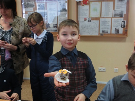 Методист музея Елена Спиридонова показала ученикам 4 класса школы №23 как сделать фигурку совы своими руками. Для создания поделки ребята использовали нехитрые материалы: шишки, ватные диски, цветную бумагу и карандаши. А орудовали дети ножницами и деревянными зубочистками.