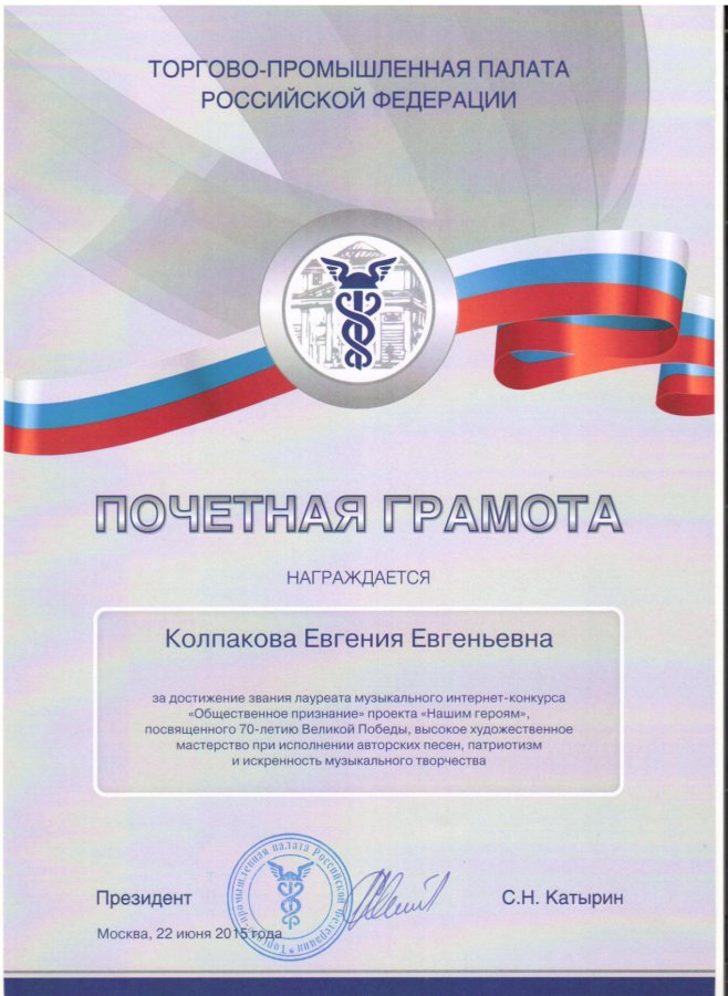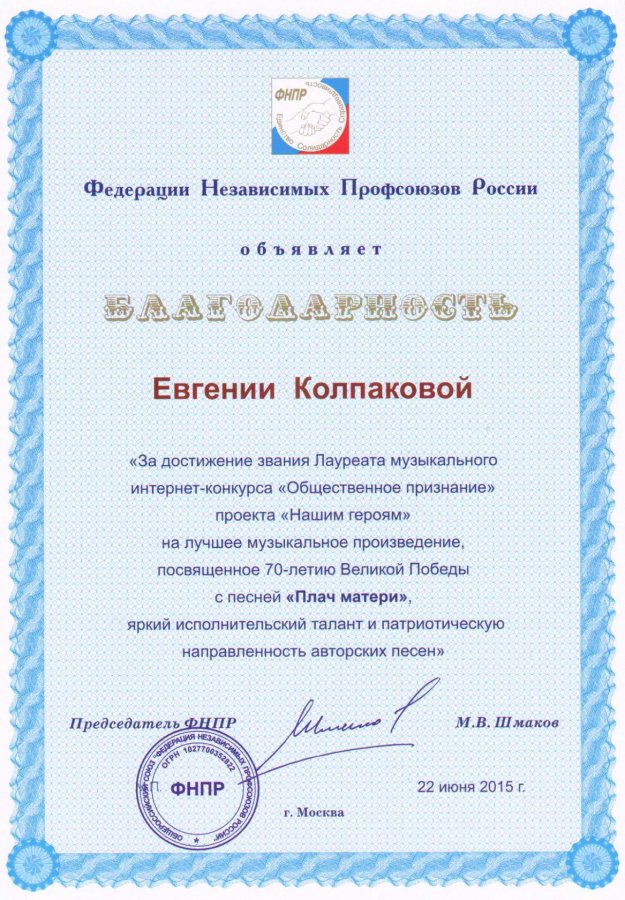Евгения Колпакова, автор из Волчанска, 24 июня привезла из столицы России заслуженные награды конкурса «Общественное признание». Их лауреат конкурса получила за песню собственного сочинения «Плач матери».